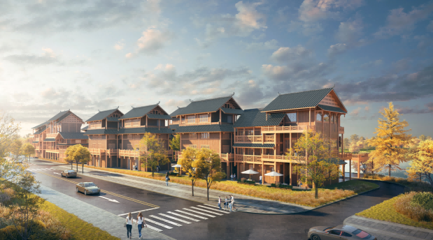 概要:本项目位于从江县北上到四寨河地块,用地范围为都柳江岸边至321国道区间带状商住用地。用地面积约为270亩。 方案设计总用地面积65846.51㎡,记容面积67169㎡,综合容积率1.02,停车位711个。 整体建筑风格结合现代建筑与木结构建筑、建筑通透性强,通过连廊将各个区域连接增加整体的通达性;建筑功能主要以商业、体育馆、拳击馆、球场、餐饮店以及游乐园等功能,结合江景打造游乐体验为主的活力商业街区。